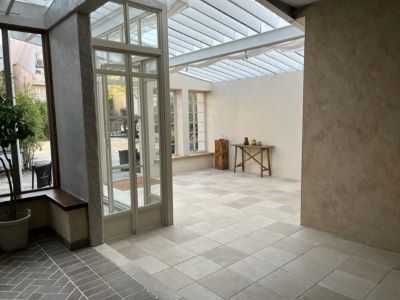 明るい陽射しがたっぷりと降り注ぐサンルーム。大きな折れ戸を開くと、ガーデンスペースから室内の塗り壁まで十分な距離がとれます。