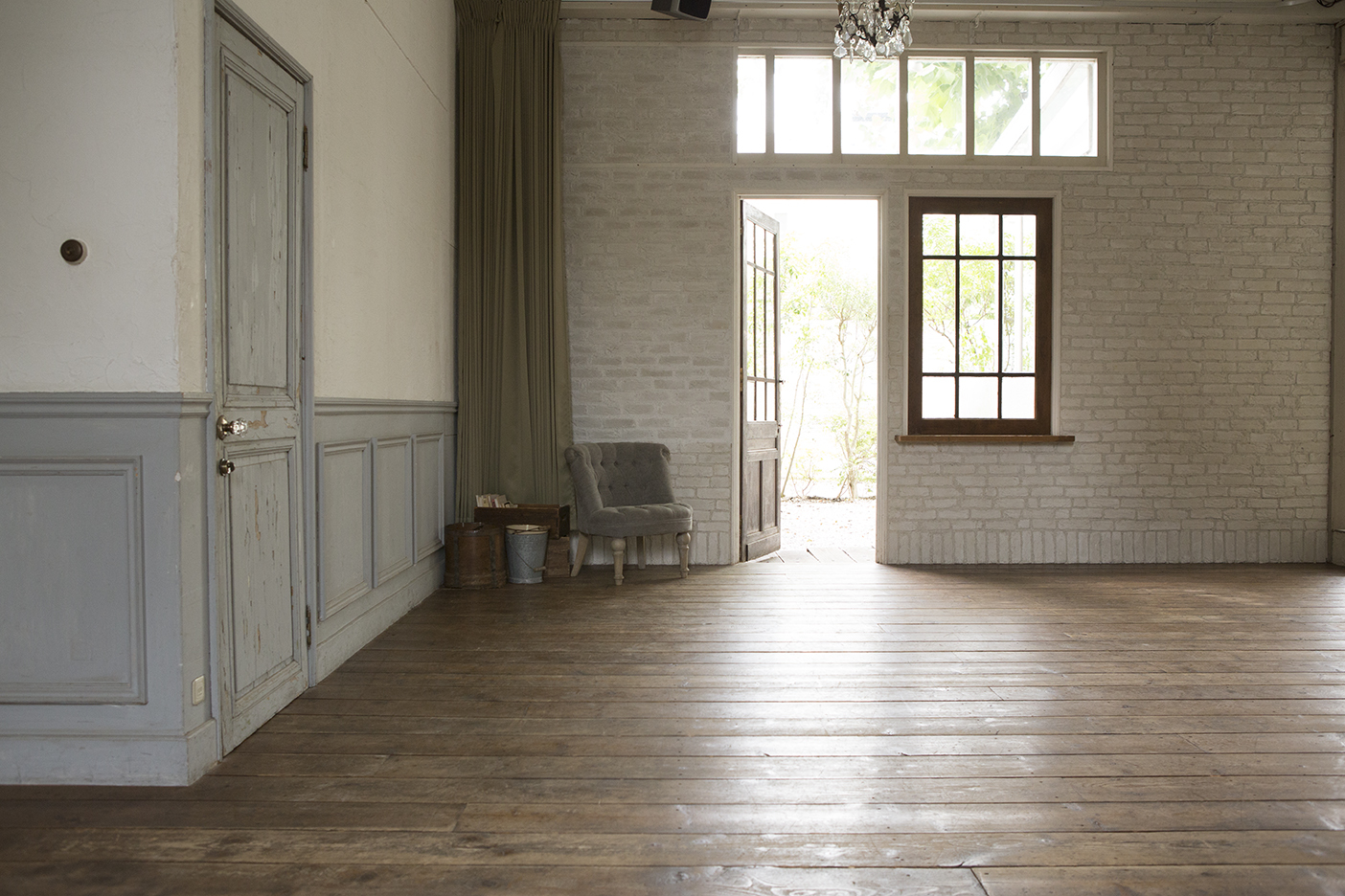淡いブルーグレーの建具とアンティークフローリングの組み合わせが印象的です。ファッションやウェディングフォトに最適です。