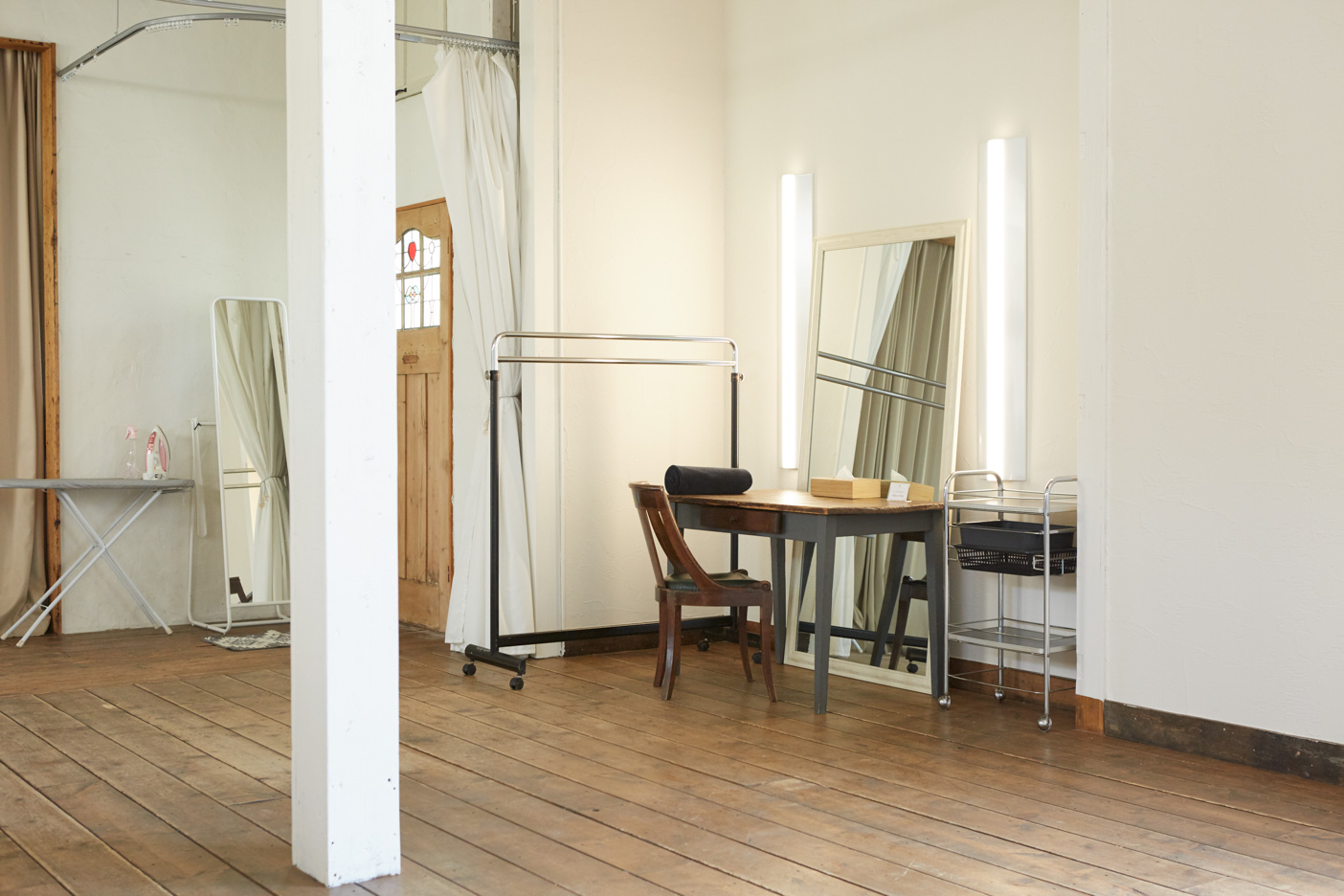 カーテンで空間を仕切って利用可能です。 備品:ハンガーラックx2、ハンガー×10、アイロンx1、姿見x1