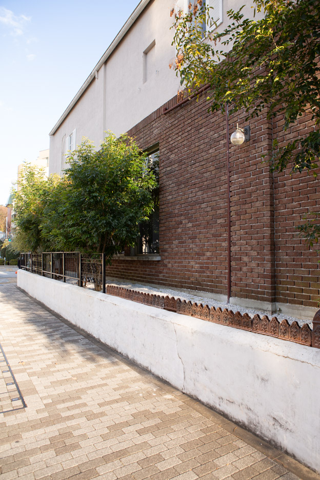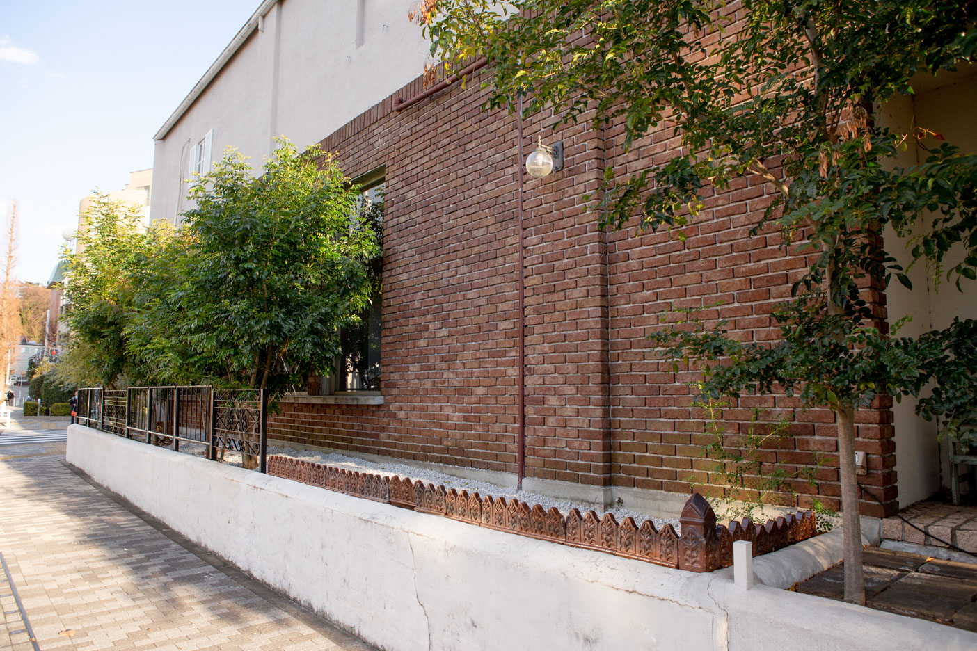 赤レンガ壁にトケイソウが絡まる外観。海外のようなシチュエーションで撮影できます。