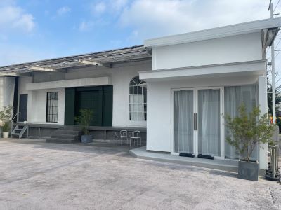 グリーン色の大扉が特徴的なエントランス。白い壁とコンクリートの質感がモダンな印象です。 駐車スペースとしても十分な広さが確保されています。