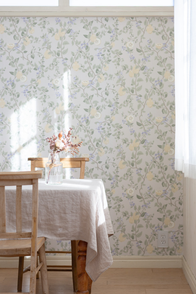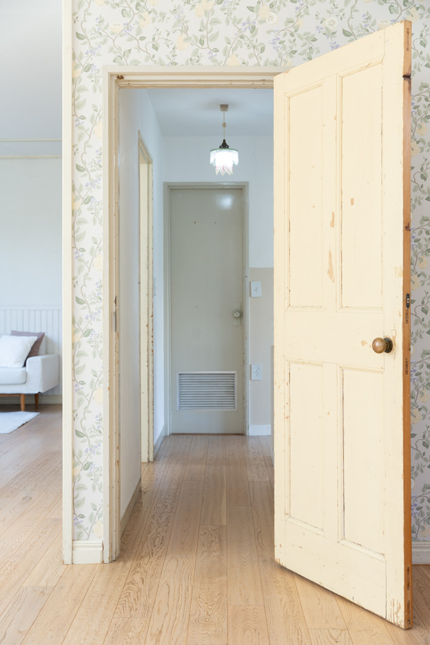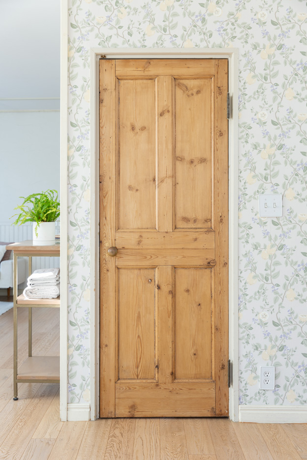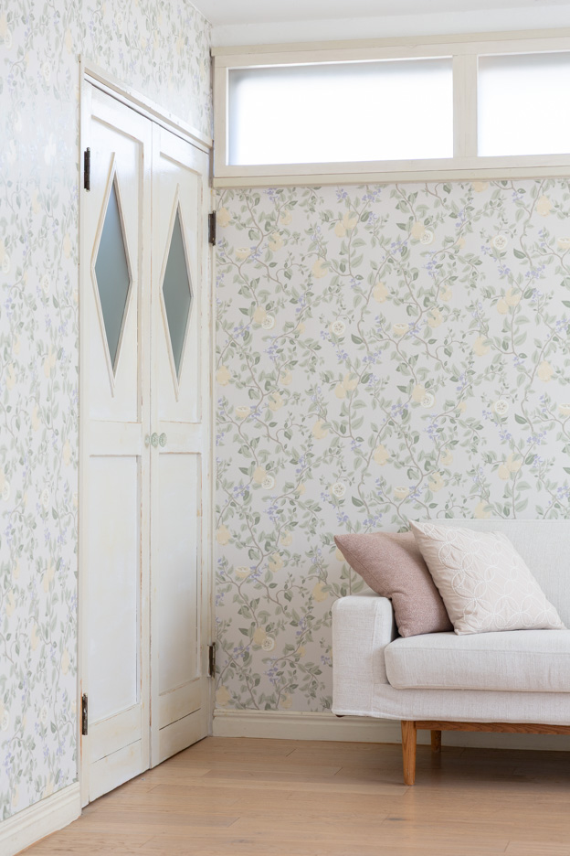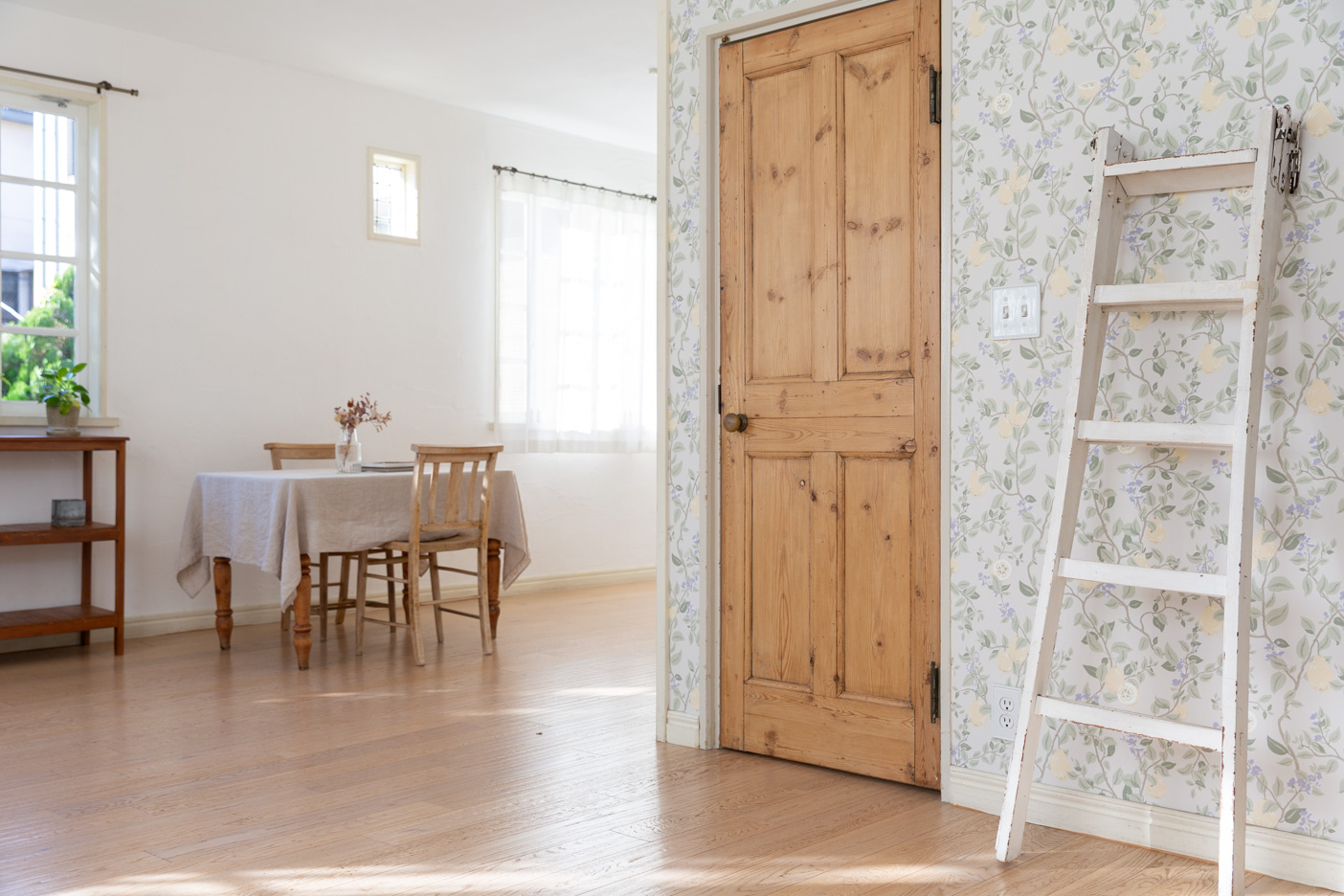 ボタニカル柄の壁紙が印象的な空間です。クローゼットの扉の、ひし形の飾りがアクセントになっています。階段に続くパイン材のドアと壁紙の組み合わせが印象的です。