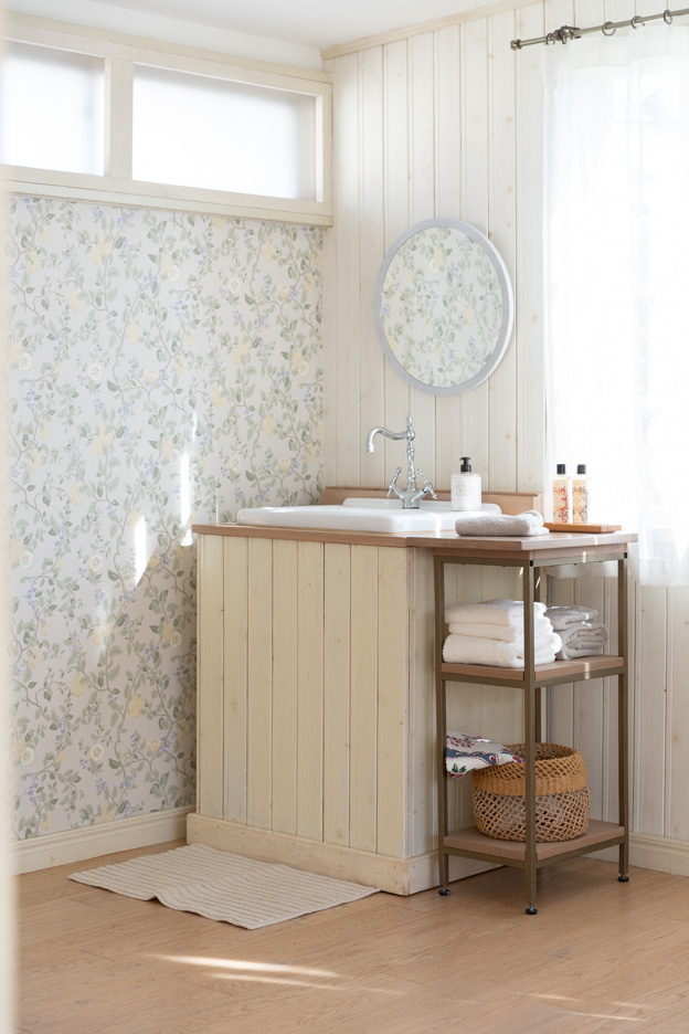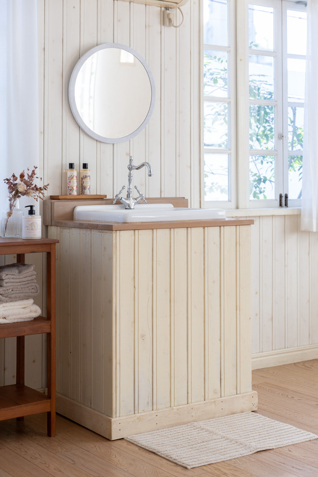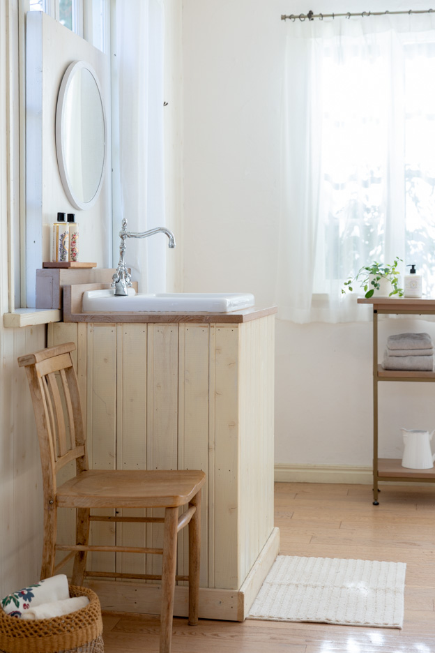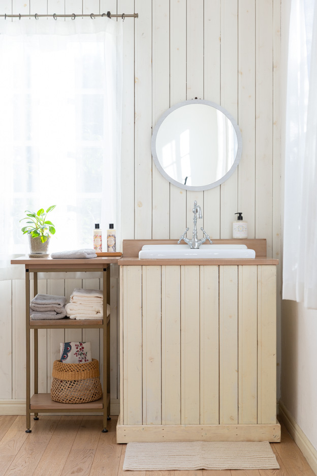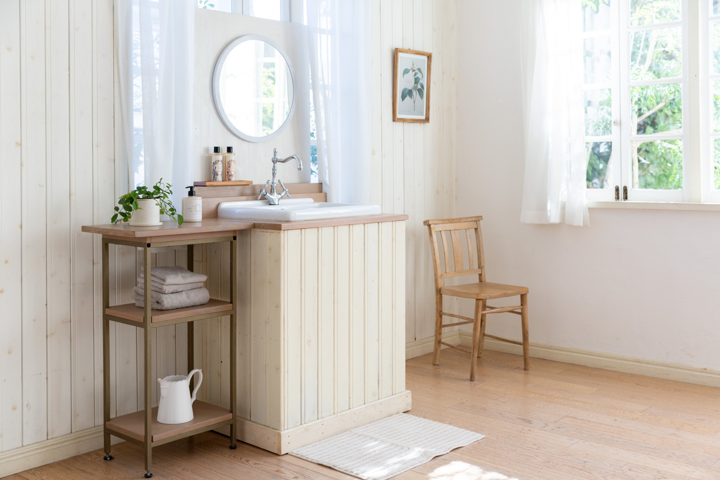 白いシンプルな板壁はどんなシーンの撮影にも合います。洗面台は移動可能ですのでシーンに合わせてご利用ください。 洗面バスルームがあるスタジオ一覧 >>