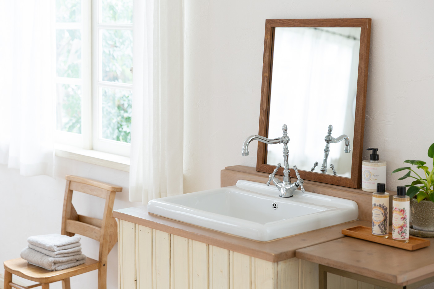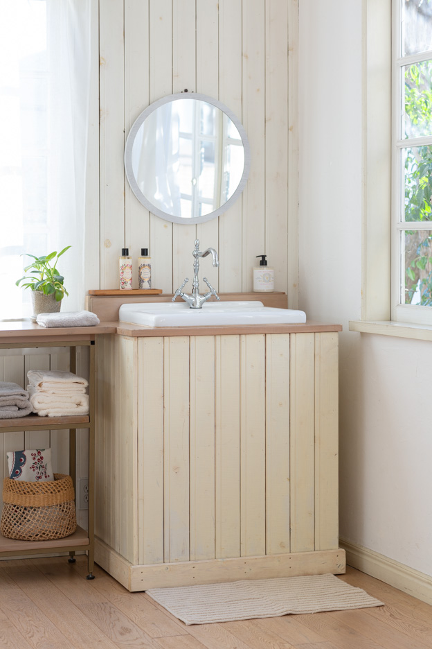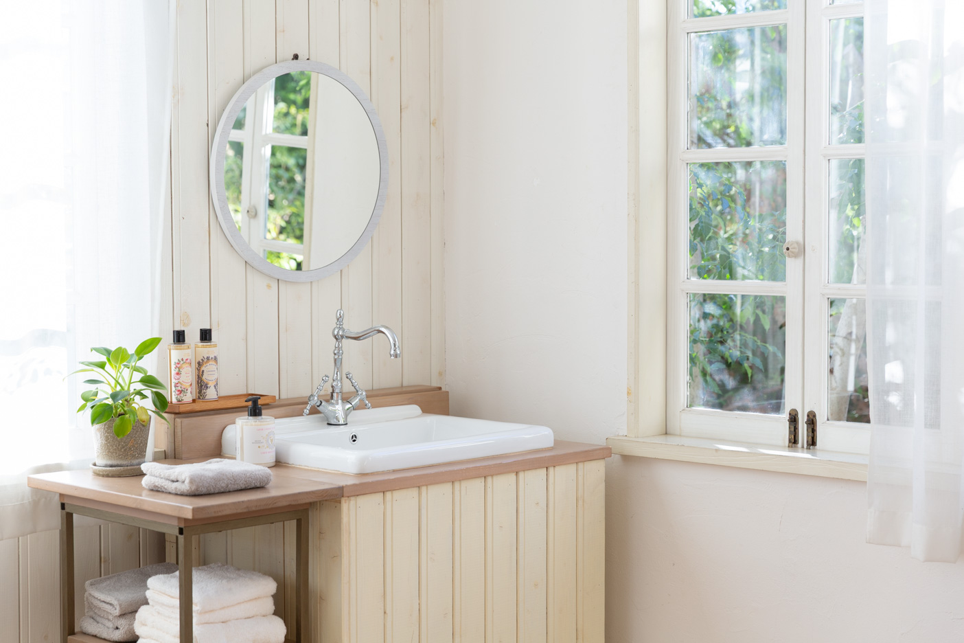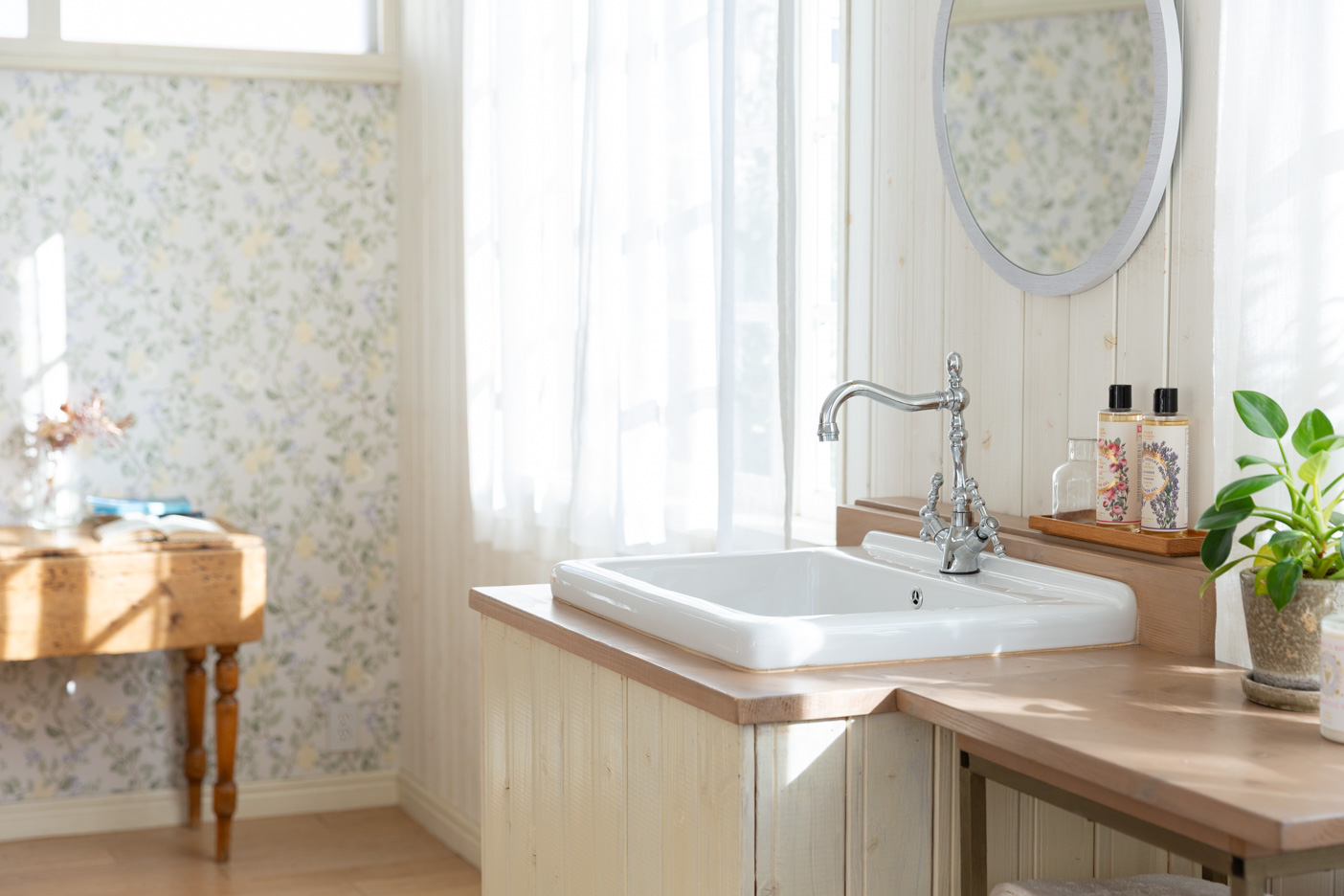 白いシンプルな板壁はどんなシーンの撮影にも合います。洗面台は移動可能ですのでシーンに合わせてご利用ください。 洗面バスルームがあるスタジオ一覧 >>
