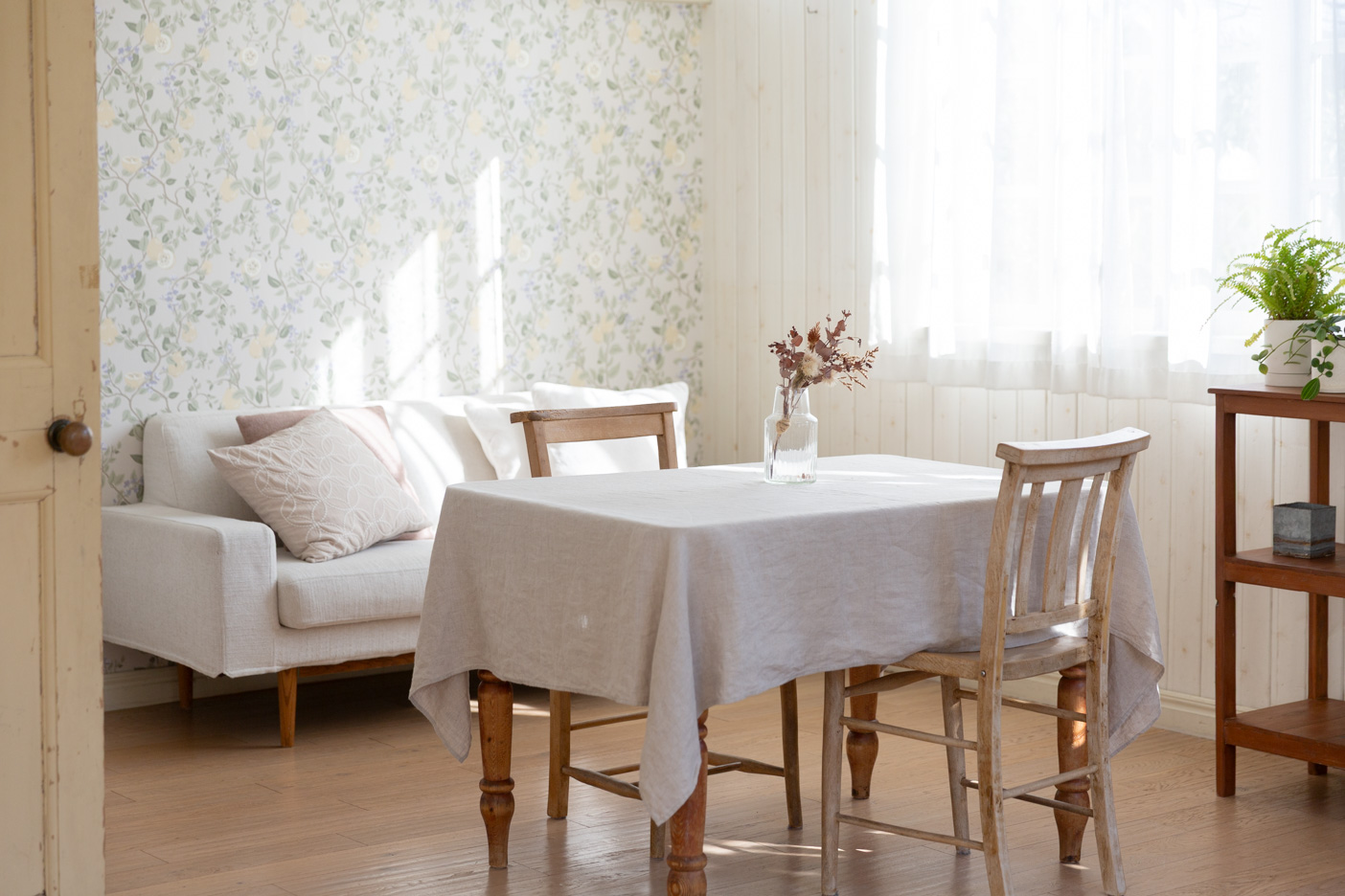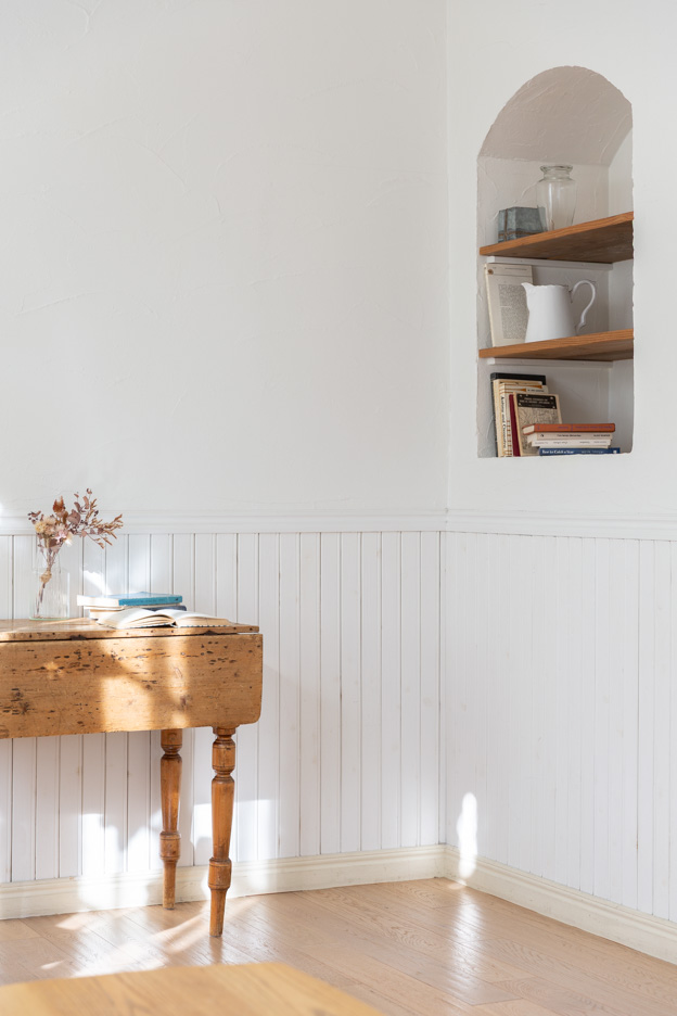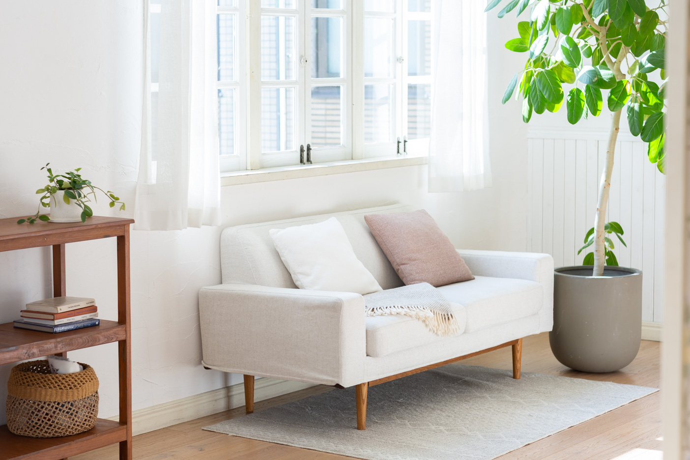 採光十分のメインルームです。日中は部屋全体に光が回ります。漆喰壁とベーシックなナチュラルフローリングが優しい空気感を作ります。