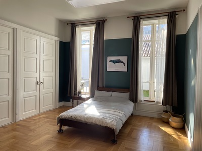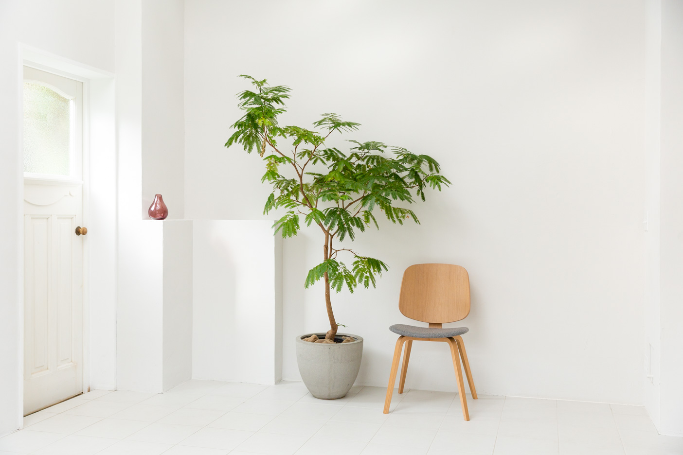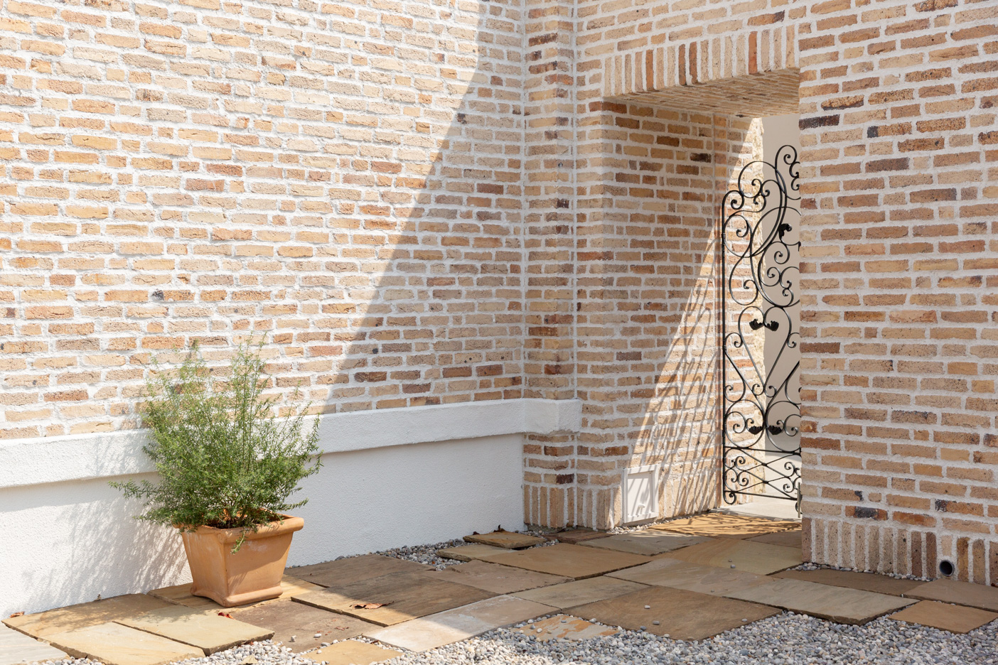 白を基調とするリビングには柔らかい光が差し込みます。ベッドルームはシックな壁と濃色のヘリンボーンフローリングの調和のとれたモダンな雰囲気。バスルームの大理石の洗面台とデザインタイルの組み合わせも印象的です。ブリック壁と木々に囲まれた195㎡の中庭は屋外でのプライベートな撮影を可能にします。