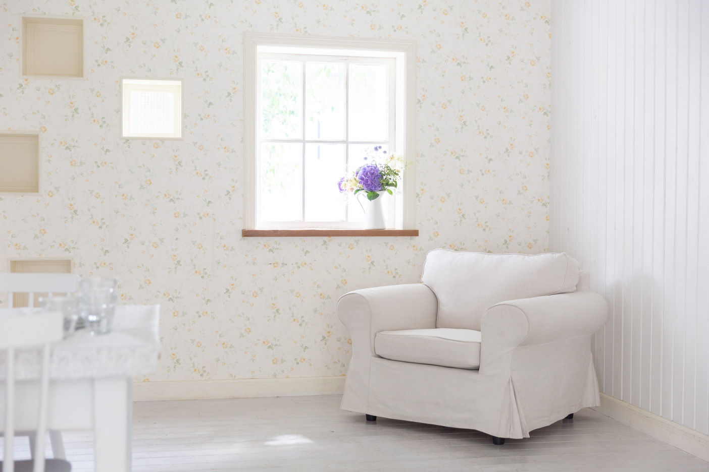 白いフローリングとピンクグレーの漆喰の壁の部屋。黄色の花柄の壁と、白い板壁の部屋。