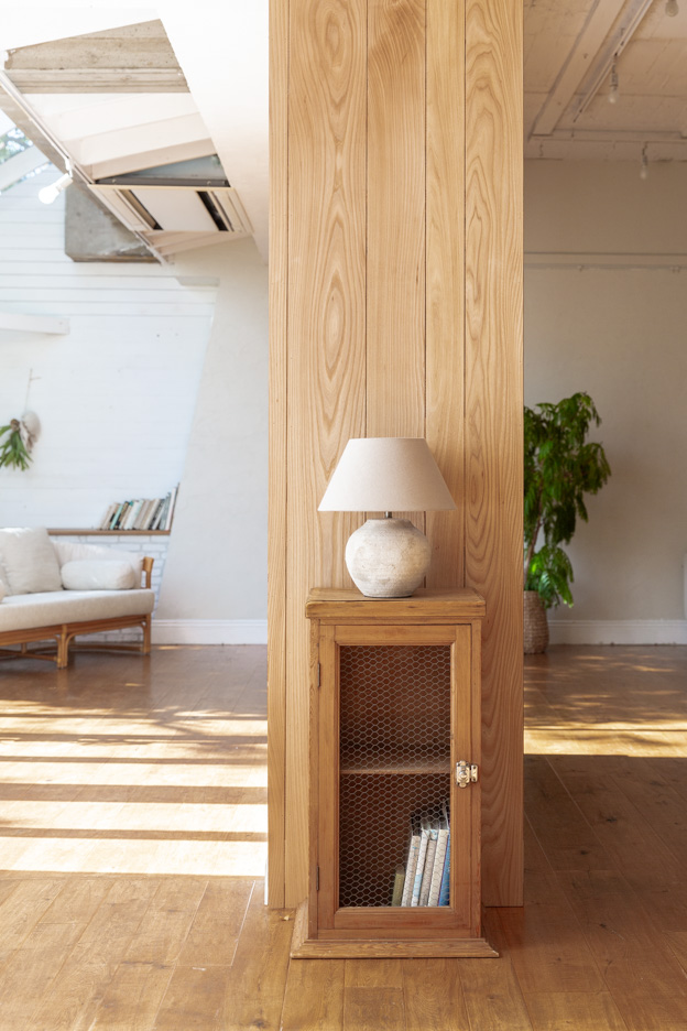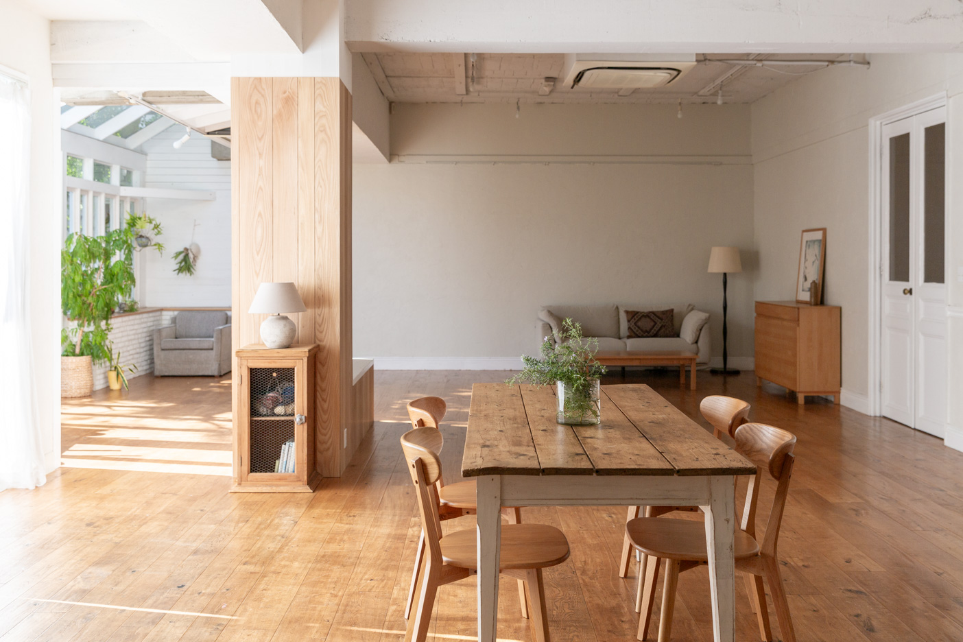 ライトグレーの漆喰の壁と、サンルームからの間接的な陽射しが印象的。天井までの高さがあり、家具を置く広さも十分です。人物撮影はもちろん、どんなシーンでも利用しやすい開放的な空間です。