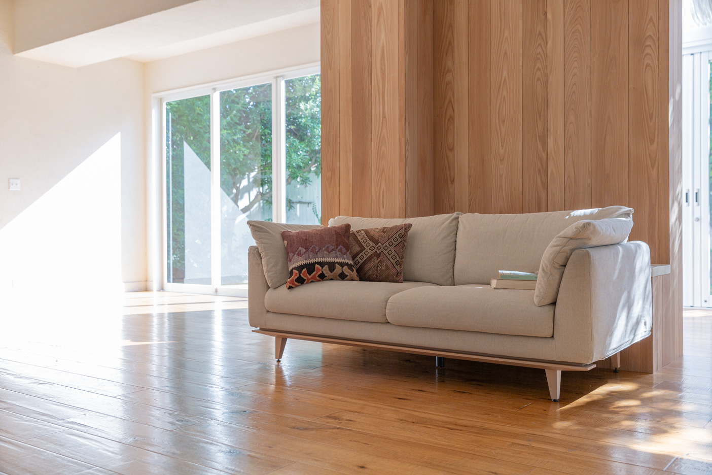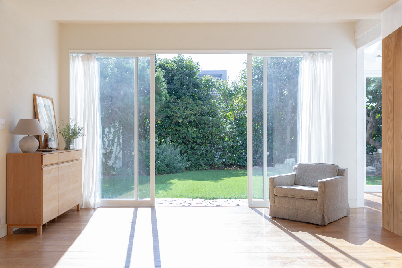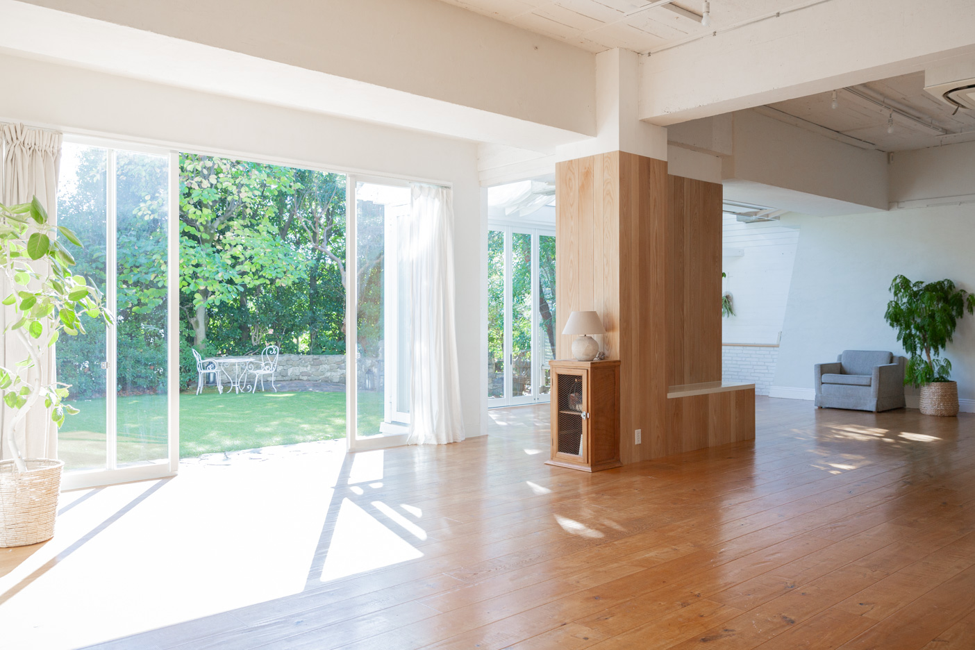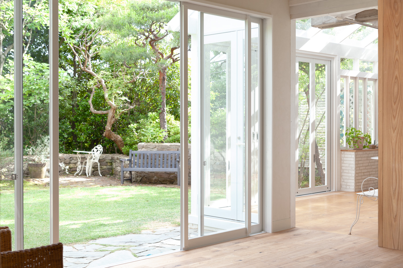 南向きの窓から降り注ぐ陽の光。フローリングの床が柔らかい印象を与えるサンルームから、色鮮やかなグリーンの庭を望めます。正面とサイドに開口部があり、サイドは折れ戸になっているため、広く開口しての撮影も可能です。