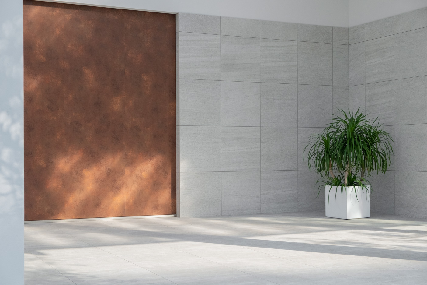 大きな格子扉が印象的な白色を基調とした空間。外へとつながる大きな開口は、様々な角度からの撮影を可能にします。