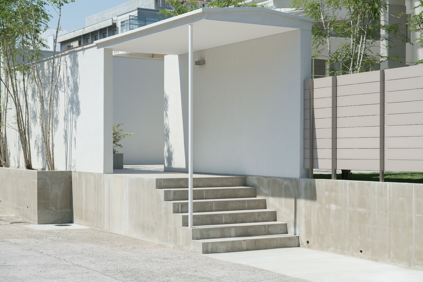 モルタル仕上げの階段、屋根を設け日陰をつくりました。スタジオへの入り口、搬入口です。