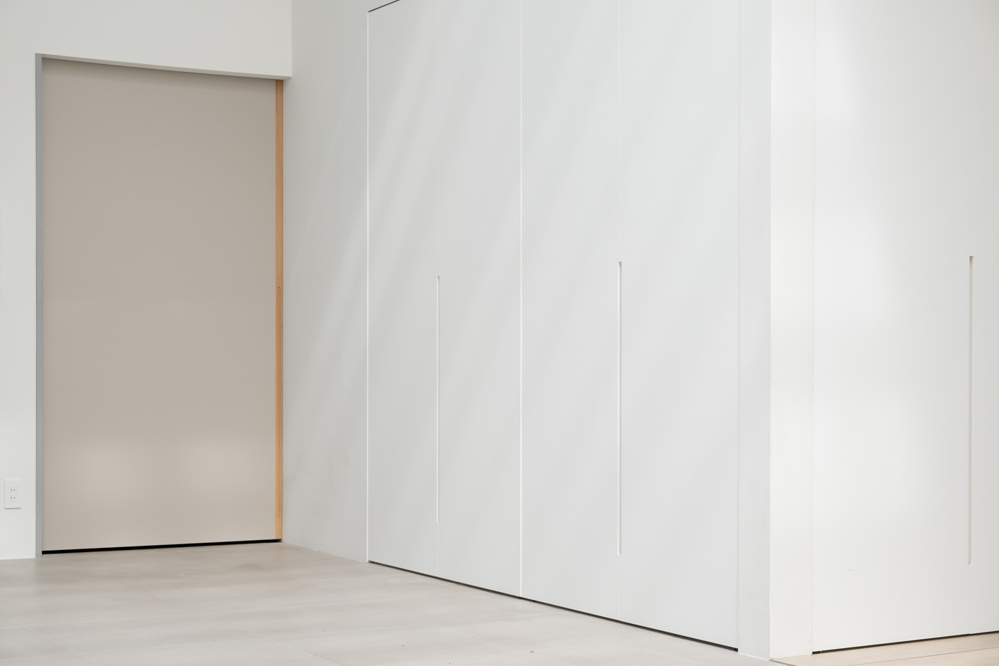 光を取り込むすっきりとしたガラス窓とライトグレー色がほどよい引き戸。石の表情のあるタイル壁。天付けカーテンレール設置あり。